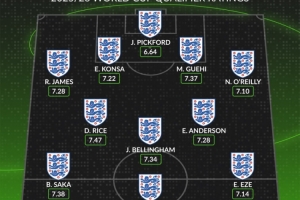 体育资讯11月17日讯 英格兰在世预赛中8战全胜,打进22球且0失球,强势进军美加墨世界杯。WhoScored评选出英格兰世预赛最高评分阵容,其中凯恩、赖斯、萨卡评分前三。
