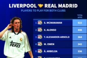 体育资讯11月5日讯 作为欧洲足坛两大豪门,利物浦和皇马曾吸引诸多球星效力。德国转会市场盘点了在两队均有效力的球员总出场次数排行,麦克马纳曼为两队共出场522次居首,皇马主帅阿隆索则以446场位居次席。