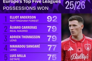 24直播11月22日讯 五大联赛球员赢得球权次数榜出炉。诺丁汉森林的埃利奥特·安德森以92次位居榜首,皇家马德里的卡雷拉斯与朗斯的托马森并列第二,均79次。AC米兰老将莫德里奇以67次排名第10。