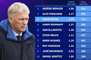24直播11月26日讯 根据德国转会市场统计,英超主帅执教场次排名出炉。温格(828场)与弗格森(809场)包揽前二,莫耶斯以728场位列第三。穆里尼奥、瓜迪奥拉及克洛普等名帅亦跻身榜单前列。