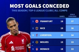 体育资讯11月27日讯 德国转会市场统计了本赛季五大联赛球队的失球数量,并列出榜单,法兰克福丢37球最多,利物浦丢34球第三。