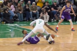 第四节最后时刻,杰伦-布朗遭滑铲倒地,裁判未吹罚犯规;对此,本场主裁Kevin Scott在赛后采访时给出了自己的理由。