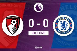 半场结束,切尔西暂0-0伯恩茅斯。