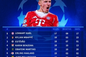 24直播12月10日讯 在欧冠3-1战胜葡体的比赛中,17岁的小将卡尔破门,成为欧冠改制后最年轻连续3场进球的球员,打破了姆巴佩的纪录。该榜单还包含了本泽马、哈兰德、贝林厄姆等众多足坛巨星的年少成名时刻。