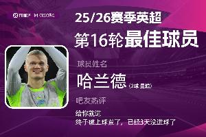 在曼城客场3-0完胜水晶宫的比赛中,哈兰德独中两元,帮助蓝月亮延续连胜势头。哈兰德获得吧友超4万票支持,成功当选【体育资讯X咪咕体育英超第16轮最佳球员】!