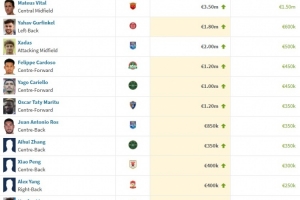 本期中超球员身价上涨幅度排名: