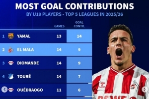 24直播12月18日讯 《转会市场》统计了本赛季五大联赛U19球员直接参与进球榜,巴萨新星亚马尔以13场14球的绝对优势领跑。科隆的马拉与莱比锡的迪奥曼德同以9球并列第二,霍芬海姆的图雷以7球位列第三,展现了年轻球员的出色进攻才华。
