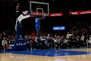 东契奇扑防三分遭乔治击中头部,痛苦蹲地缓行良久。
