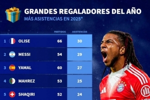 24直播12月25日讯 德国转会市场统计了2025年球员的俱乐部与国家队助攻榜。奥利塞以30次助攻位居榜首,梅西以29次助攻紧随其后。亚马尔(27次)、马赫雷斯(25次)等球员也位列榜单前列。