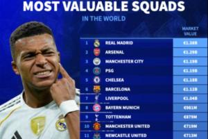 体育资讯12月26日讯 2025年接近尾声,德转列出了全球球队身价排名前二十,皇马以13.8亿欧排名第一,阿森纳12.9亿欧第二,曼城、巴黎分列第三、第四。