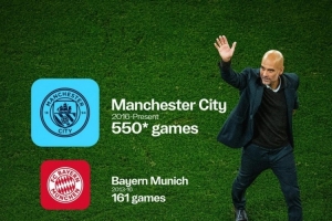 此役将是瓜迪奥拉执教生涯带队参加的第1000场比赛,曼城官方社媒晒出瓜帅执教场次的分布。