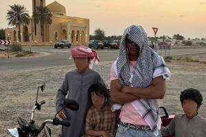 在社交媒体上,亚马尔晒出了和阿拉伯儿童在一起的照片,他自己则“头顶一块布”化身阿拉伯人,戴着墨镜的他酷劲十足。