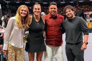 本场比赛,大罗和妻子塞琳娜现场观战比赛,大罗与萨巴伦卡、克耶高斯合影。