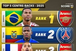 24直播12月31日讯 Score90媒体评选出2025年世界足坛各位置最佳球员。其中,阿森纳的加布里埃尔和萨利巴分列中后卫前二,巴黎的阿什拉夫和门德斯包揽左右后卫前二,皇马的库尔图瓦则荣膺最佳门将。