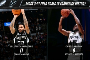 11记三分打破马刺队史单场三分球命中纪录,此前由查克·珀森保持(9记)。
