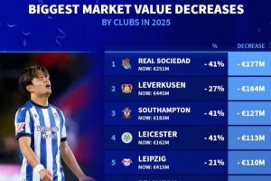 24直播01月02日讯 《转会市场》公布2025年度球队身价贬值榜。西甲皇家社会和德甲勒沃库森位居前两位,贬值额均超1.6亿欧元。榜单中,拉斯帕尔马斯贬值率最高,达66%,曼联则以7.6亿的贬值额位列第九。多家欧洲俱乐部身价在年内出现明显下滑。