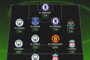 24直播01月02日讯 whoscored公布2025年12月英超最佳阵,曼城4将入选。门将为切尔西的桑切斯。后卫线包括曼城努内斯等四人。中场有曼城福登、谢尔基及曼联B费等四人。前锋则是曼城哈兰德和利物浦埃基蒂克。