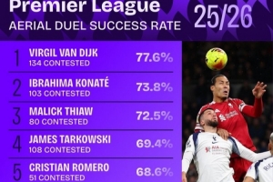 24直播01月03日讯 根据Squawka数据,本赛季英超争顶成功率榜中,利物浦双中卫表现突出。队长范戴克以134次争顶和77.6%的成功率高居榜首,队友科纳特以73.8%的成绩紧随其后,包揽前二。纽卡斯尔的佳夫位列第三。