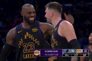 奋力追击!詹姆斯里突外投连得5分 帮助湖人迫近比分打停雄鹿