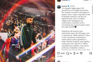 布雷默达成尤文生涯出战100场里程碑,他在社交媒体上写道:“能够身披黑白战袍出战100场比赛,我深感自豪。我正在这家俱乐部经历美妙的时光,我要感谢整个尤文大家庭,这对我意义非凡。”
