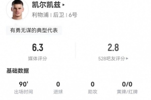 体育资讯1月5日讯 利物浦在本轮英超对阵富勒姆,左后卫凯尔凯兹本场数据如下: