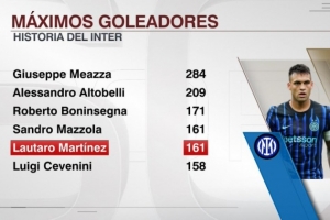 24直播11月10日讯 11月10日意甲焦点战,国米2-0击败拉齐奥,前锋劳塔罗进球建功。此球使他以161粒总进球,追平传奇球星马佐拉,并列升至国米队史射手榜第4位。