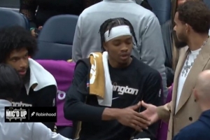 全面压制!贾勒特·阿伦大帽拒绝兰德尔扣篮 反击力压兰德尔暴扣
