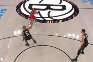 全面压制!贾勒特·阿伦大帽拒绝兰德尔扣篮 反击力压兰德尔暴扣