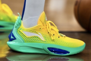 入场时库里穿的是韦伯CDubbz 球鞋,到了热身阶段库里换了一双鞋,是队友巴特勒的签名鞋——李宁 JB3 巴西配色。