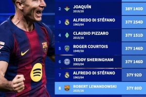 8、莱万(巴萨,2025-26赛季):37岁80天