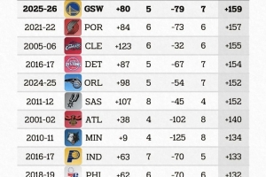 据统计,勇士本赛季至今12场比赛,主场净胜对手80分,客场净负79分,主客场净胜分差值达到159,创下了本世纪以来所有球队赛季前12场比赛的最悬殊纪录。